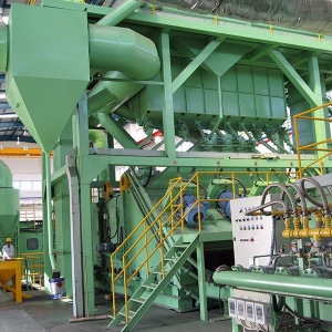 钢板预处理线专门处理6-200mm钢板,钢板预热处理后由进料输送系统送至封闭的抛丸清理室,利用抛丸器高速旋转的叶轮将钢丸(铸钢丸和钢丝切丸)加速抛打至工件表面,对工件进行冲击、刮削,以清除工件表面的铁锈、氧化皮和污物。利用刮扫装置高强度尼龙滚刷、收丸螺旋、高压吹风管将工件表面的积丸、积尘和浮尘吹扫干净。除锈后的钢板直接进入喷漆室,通过装在上下喷漆小车上的喷枪将车间保养底漆喷涂在工件表面上,然后进入烘干室烘干。使钢板表面漆膜达到指干状态后快速送出。